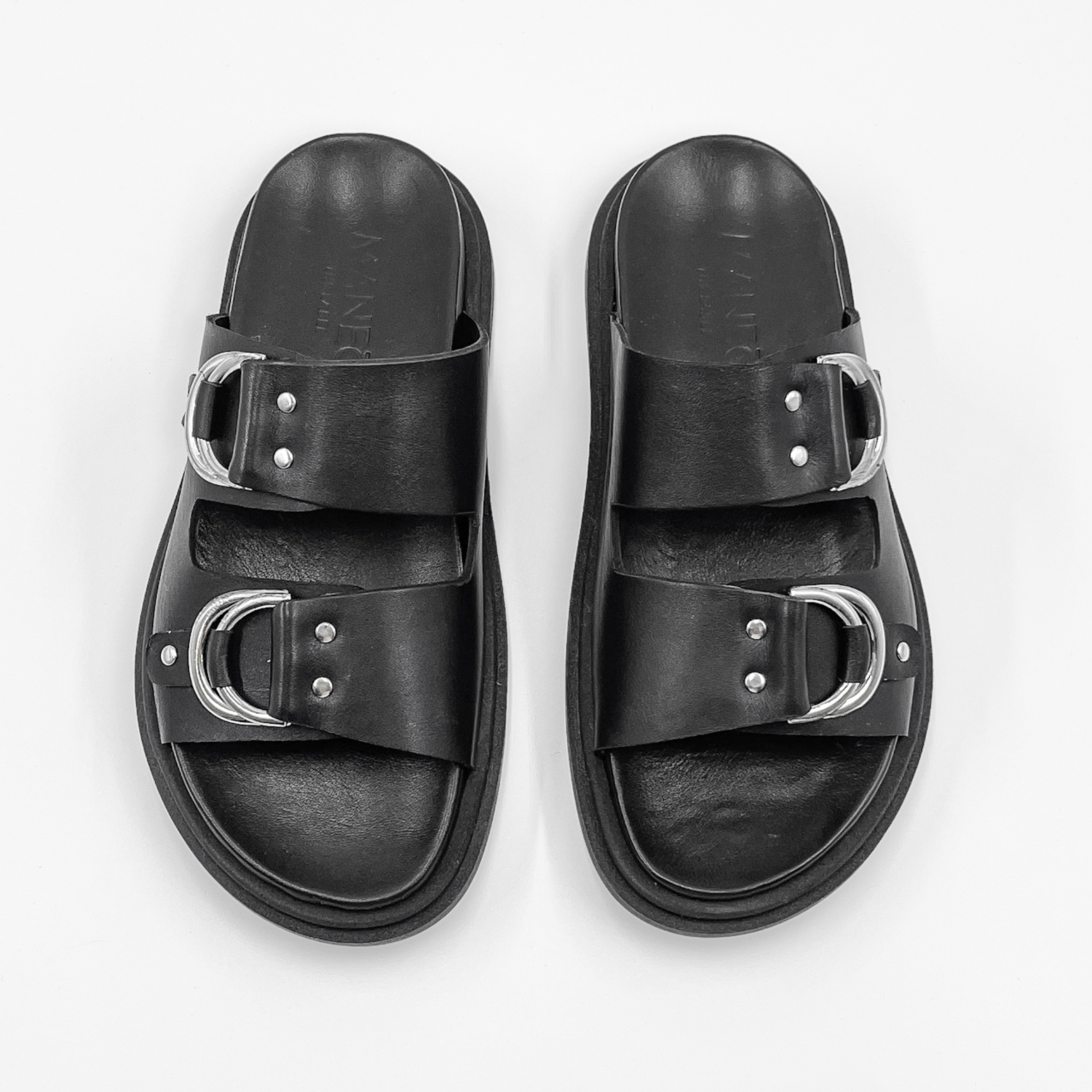 'Ariel' slides are made from smooth leather. They're designed with silver buckles and molded leather foot beds for extra comfort.