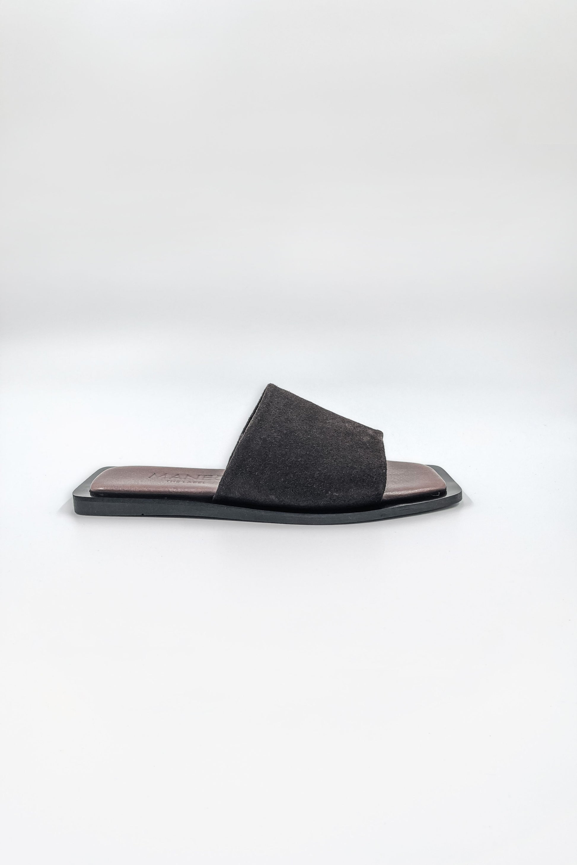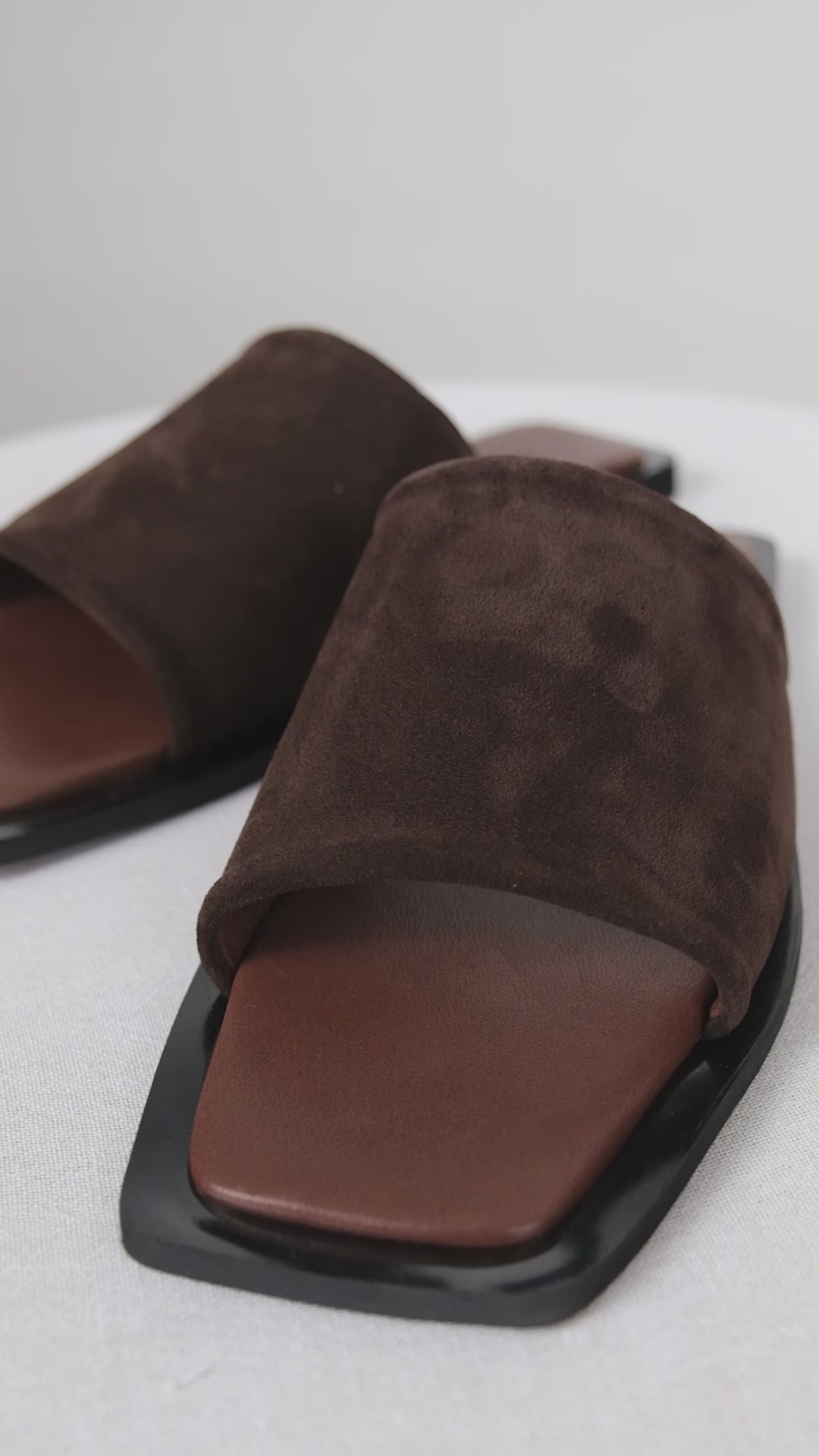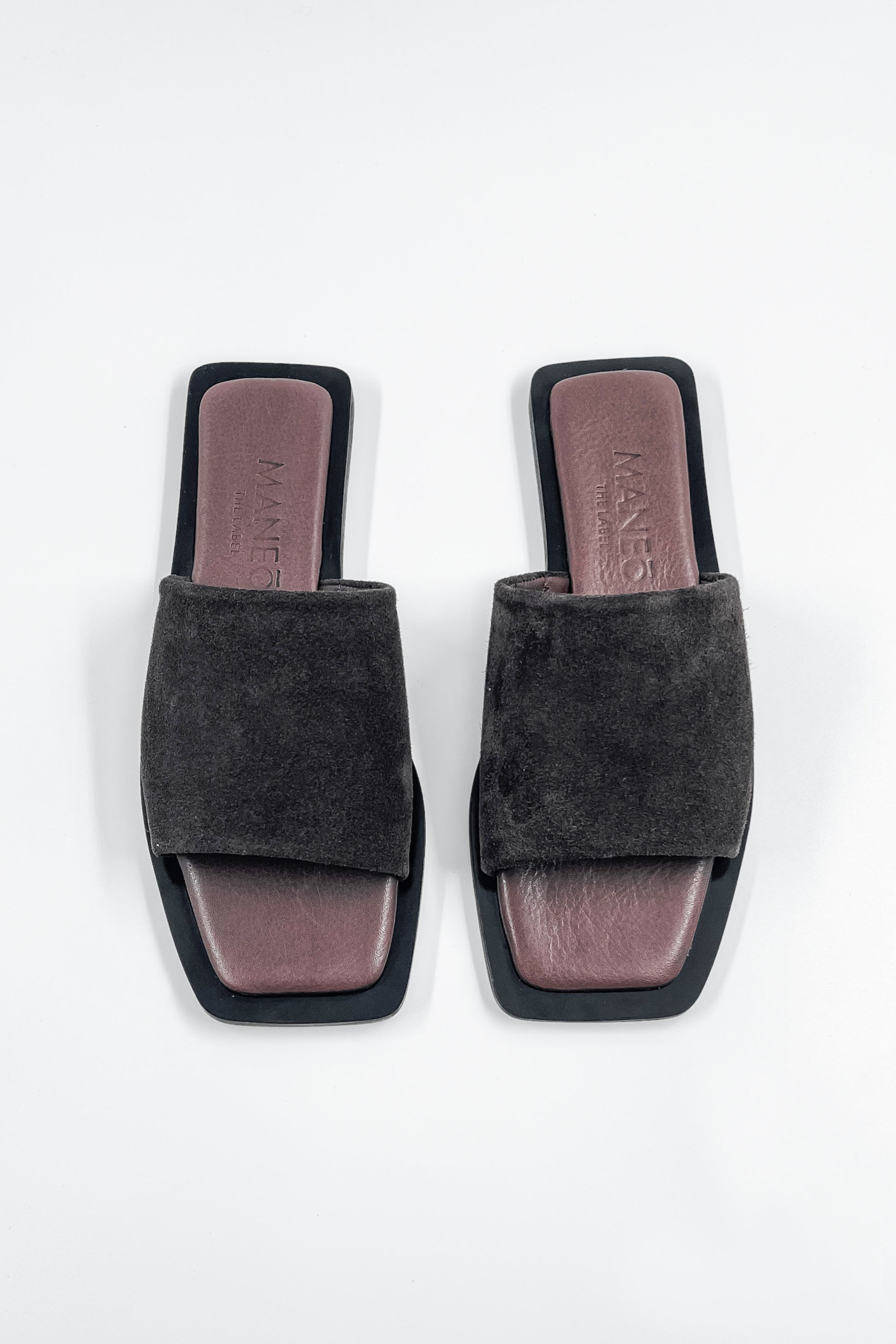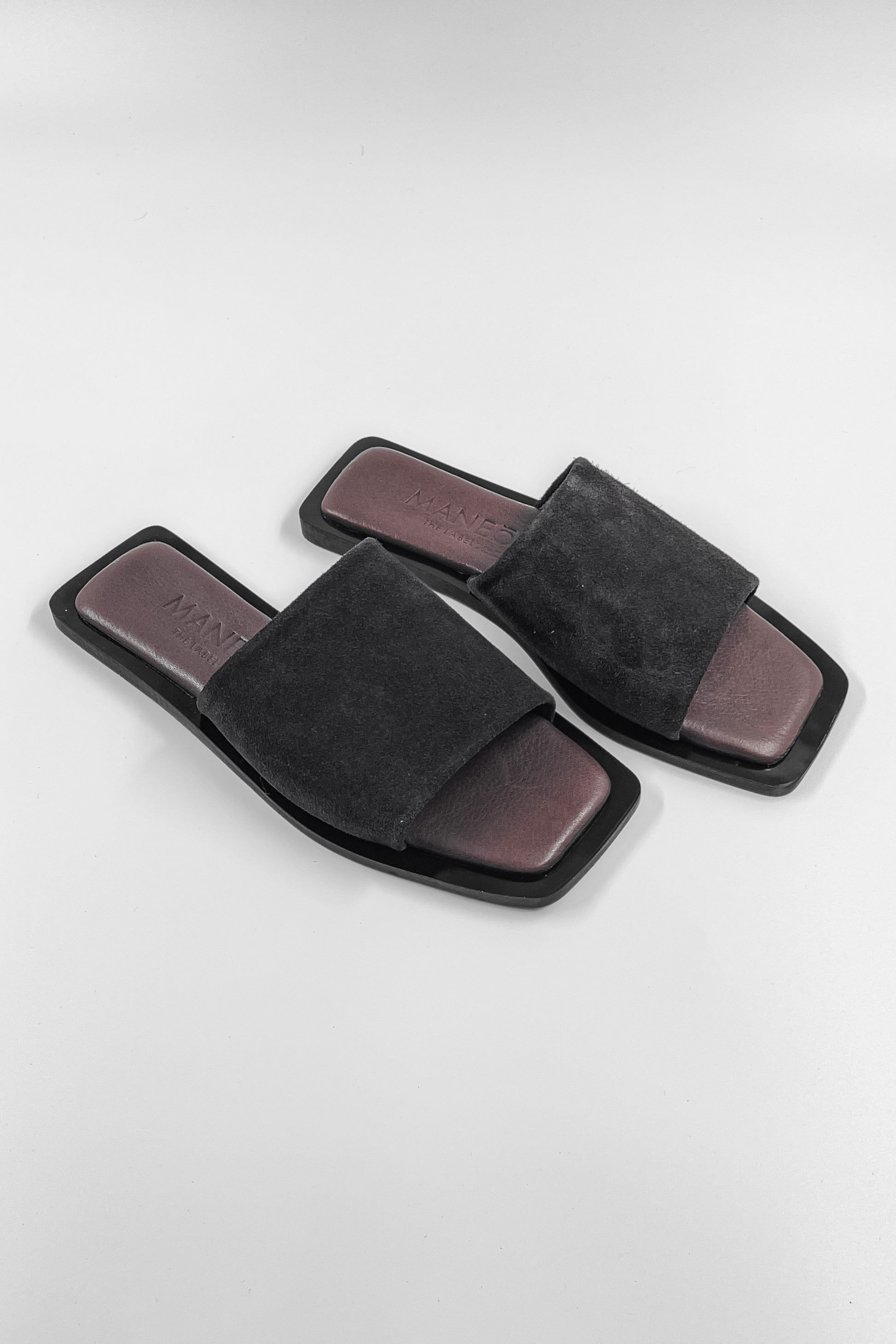 • Flat silhouette, Minimal slide design, Soft Leather, Open square toe