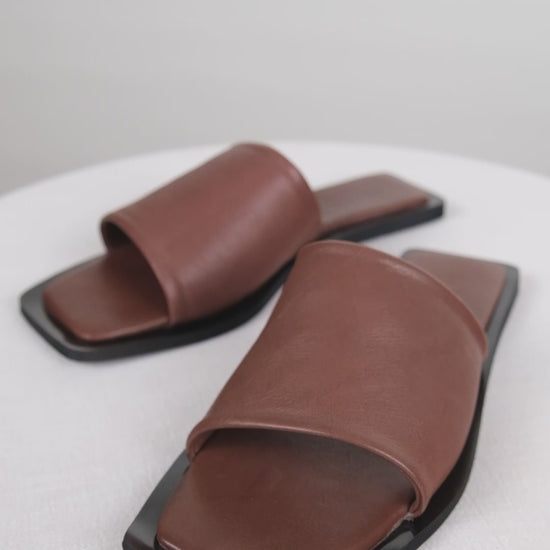 • Flat silhouette, Minimal slide design, Soft Leather, Open square toe