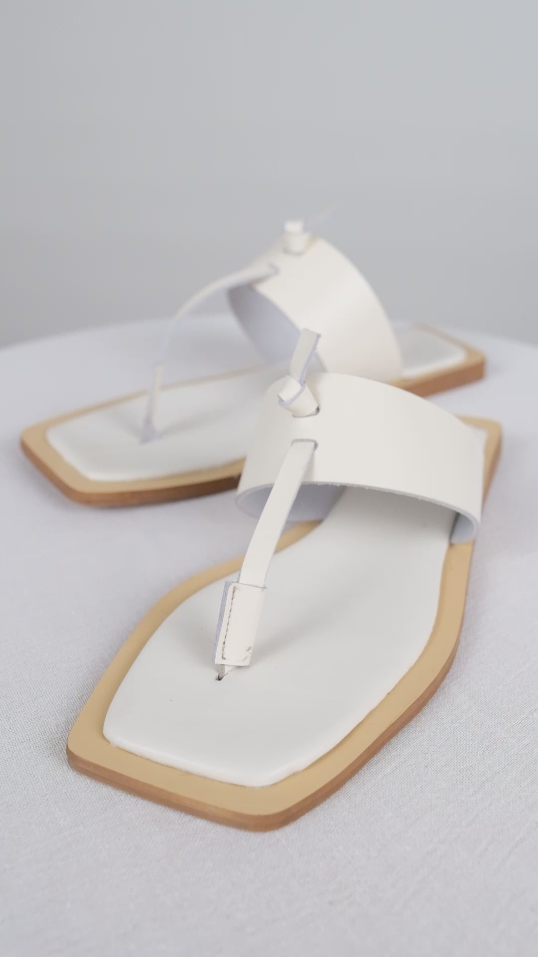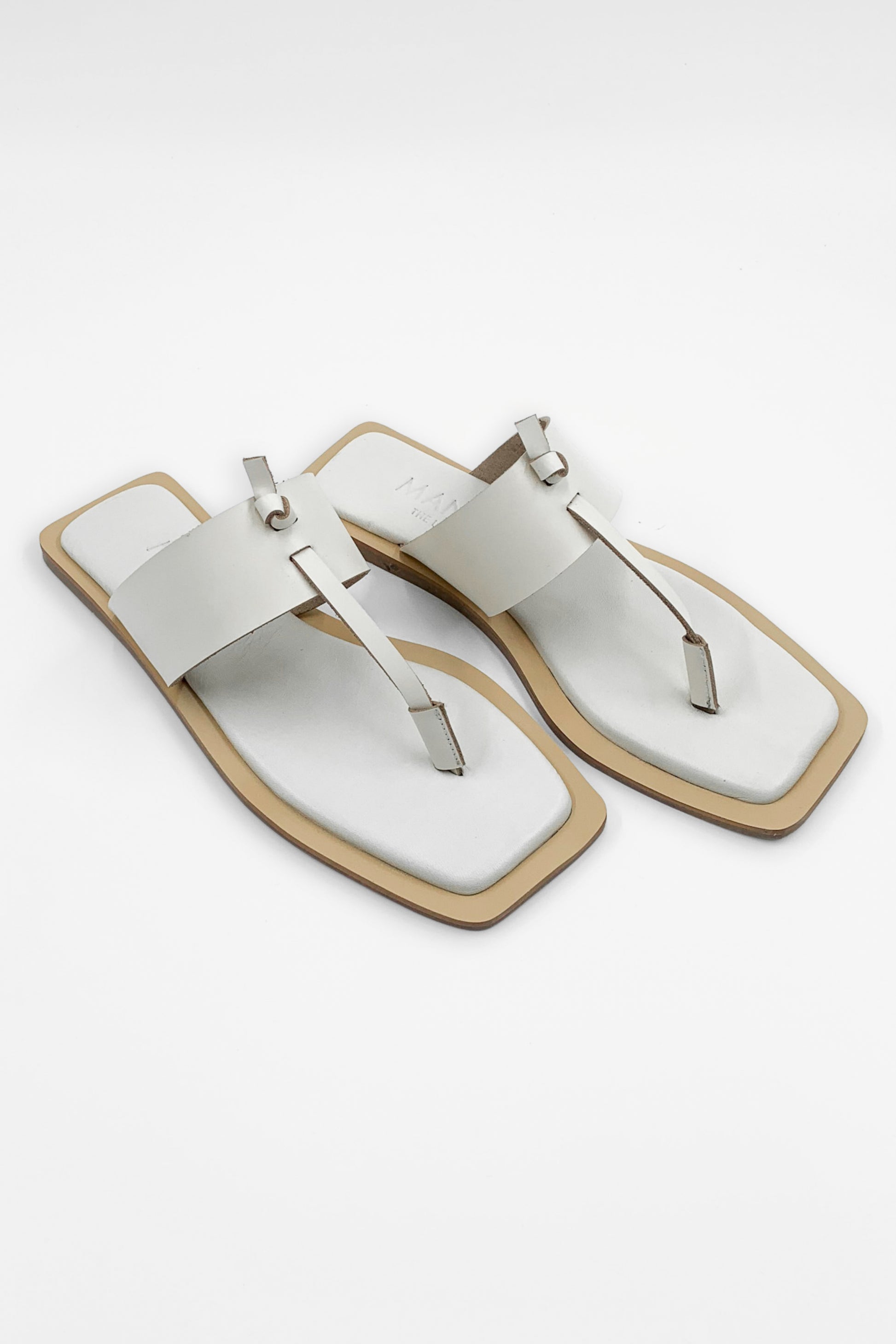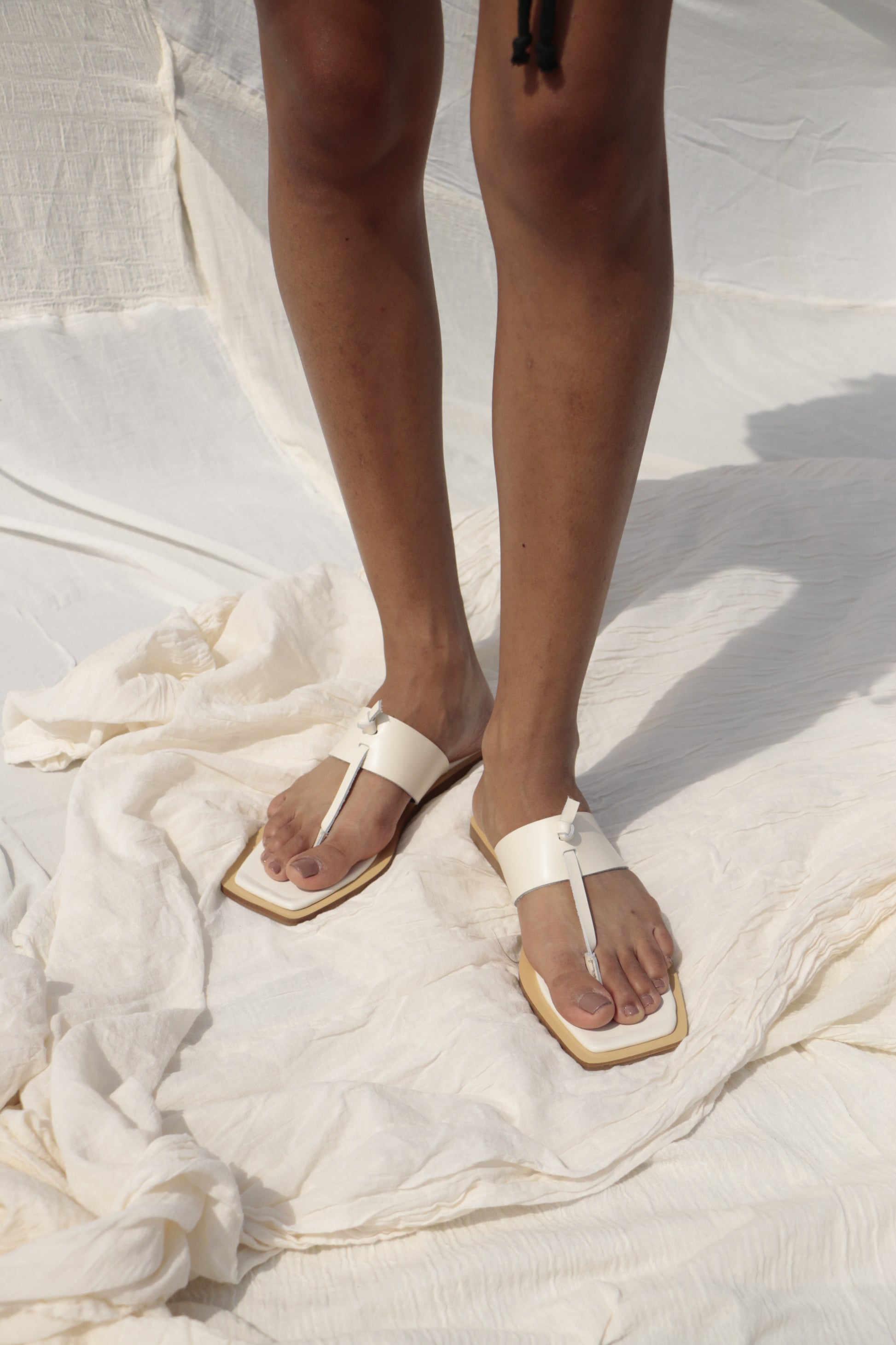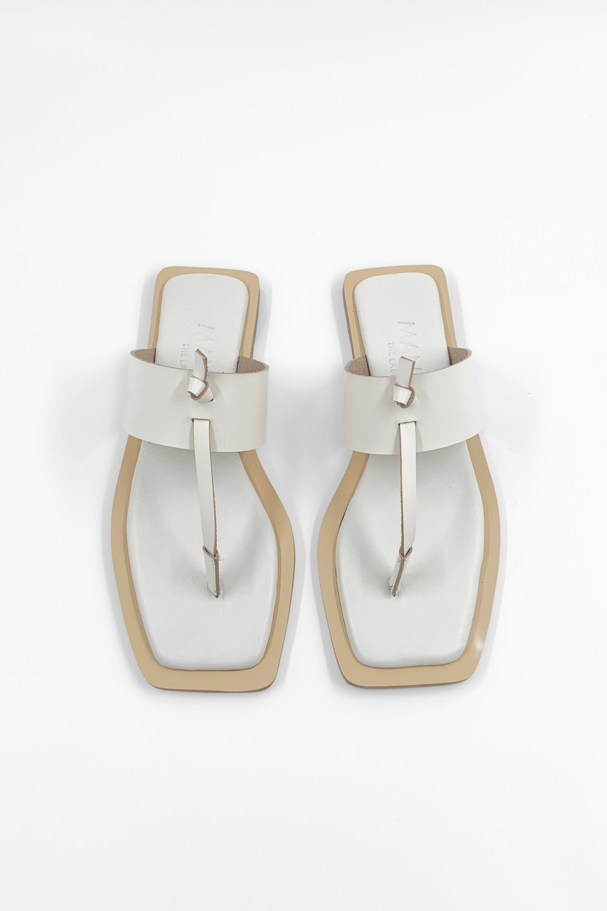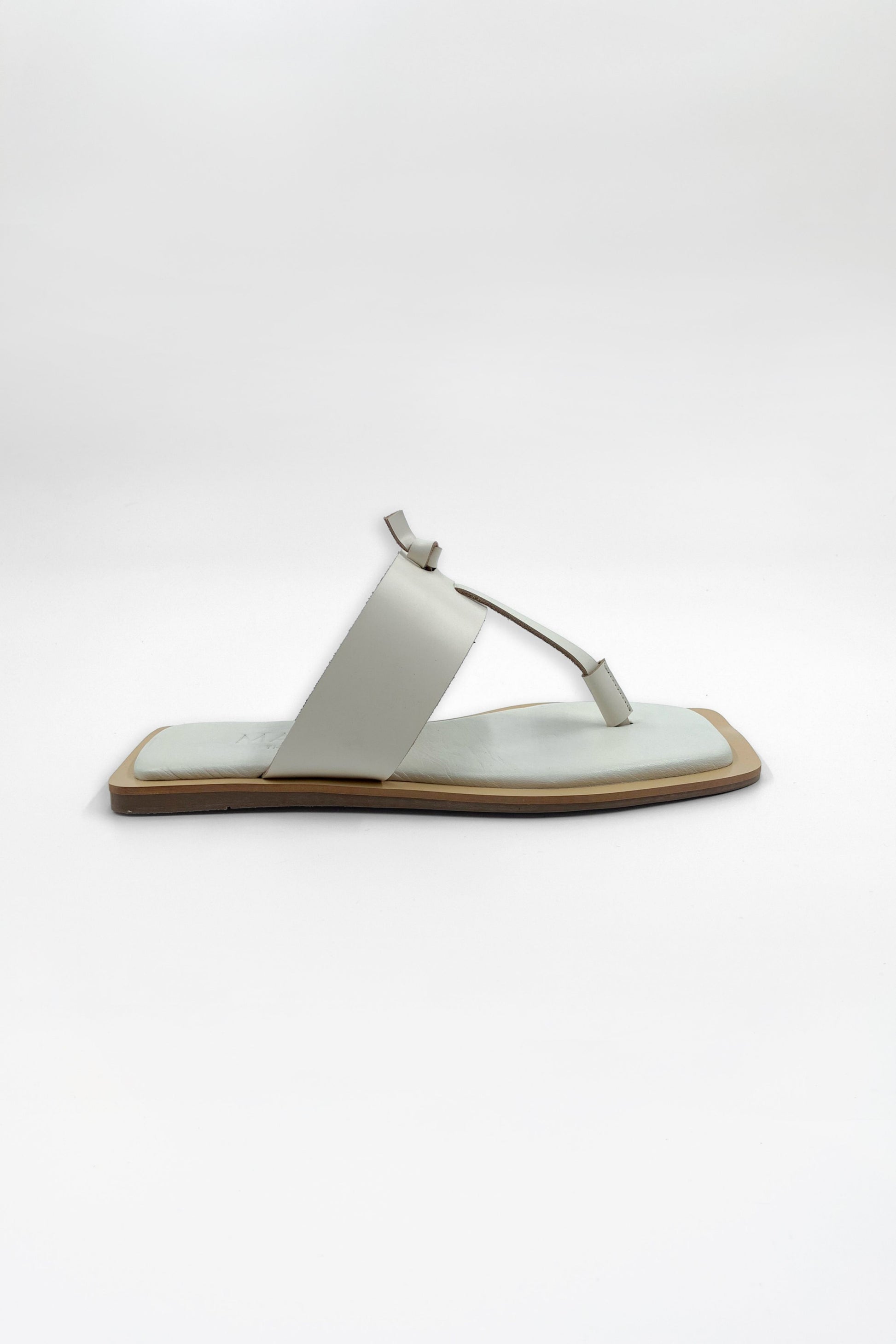 • Flat silhouette, Modern t-strap design, Vegetable leather, Open square toe.