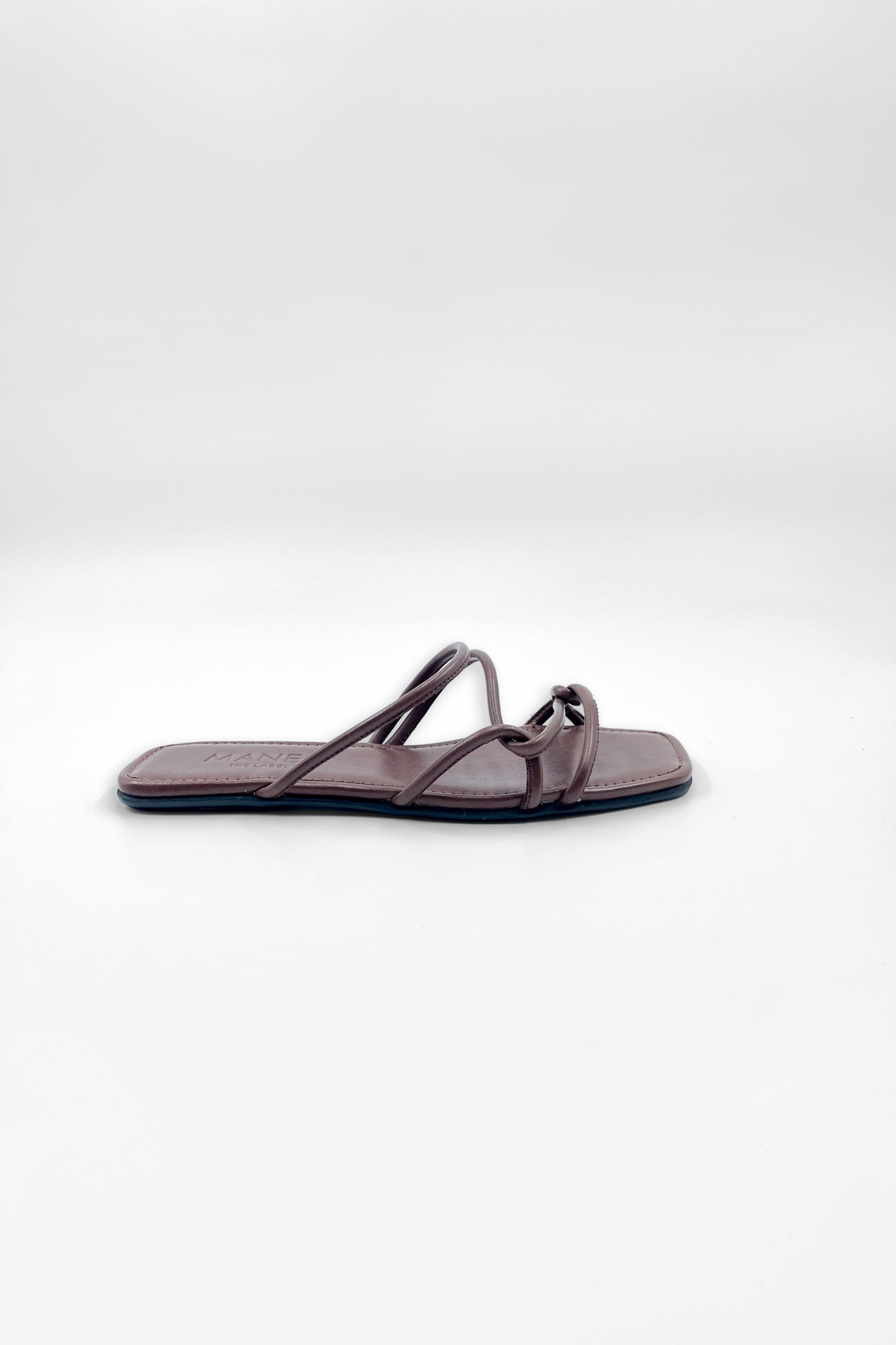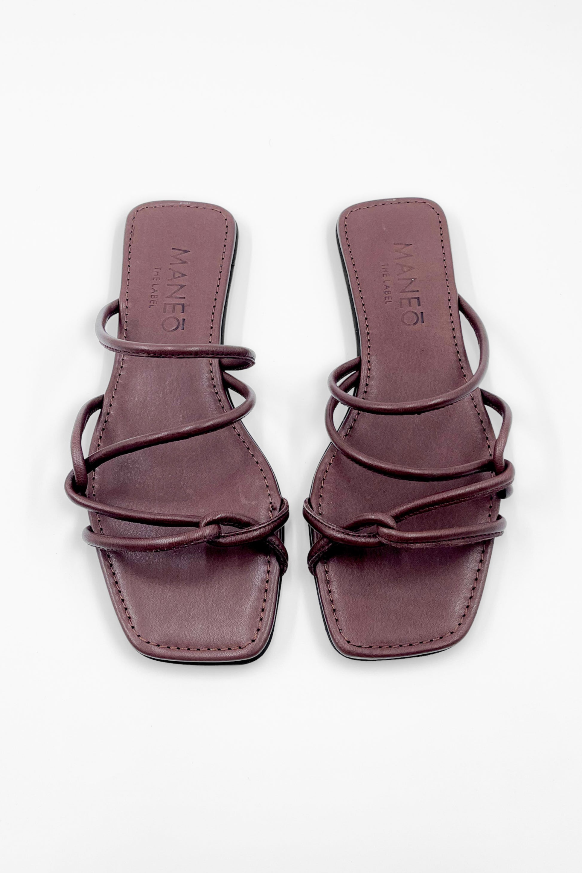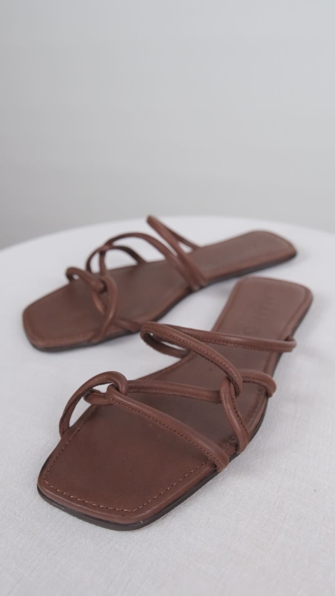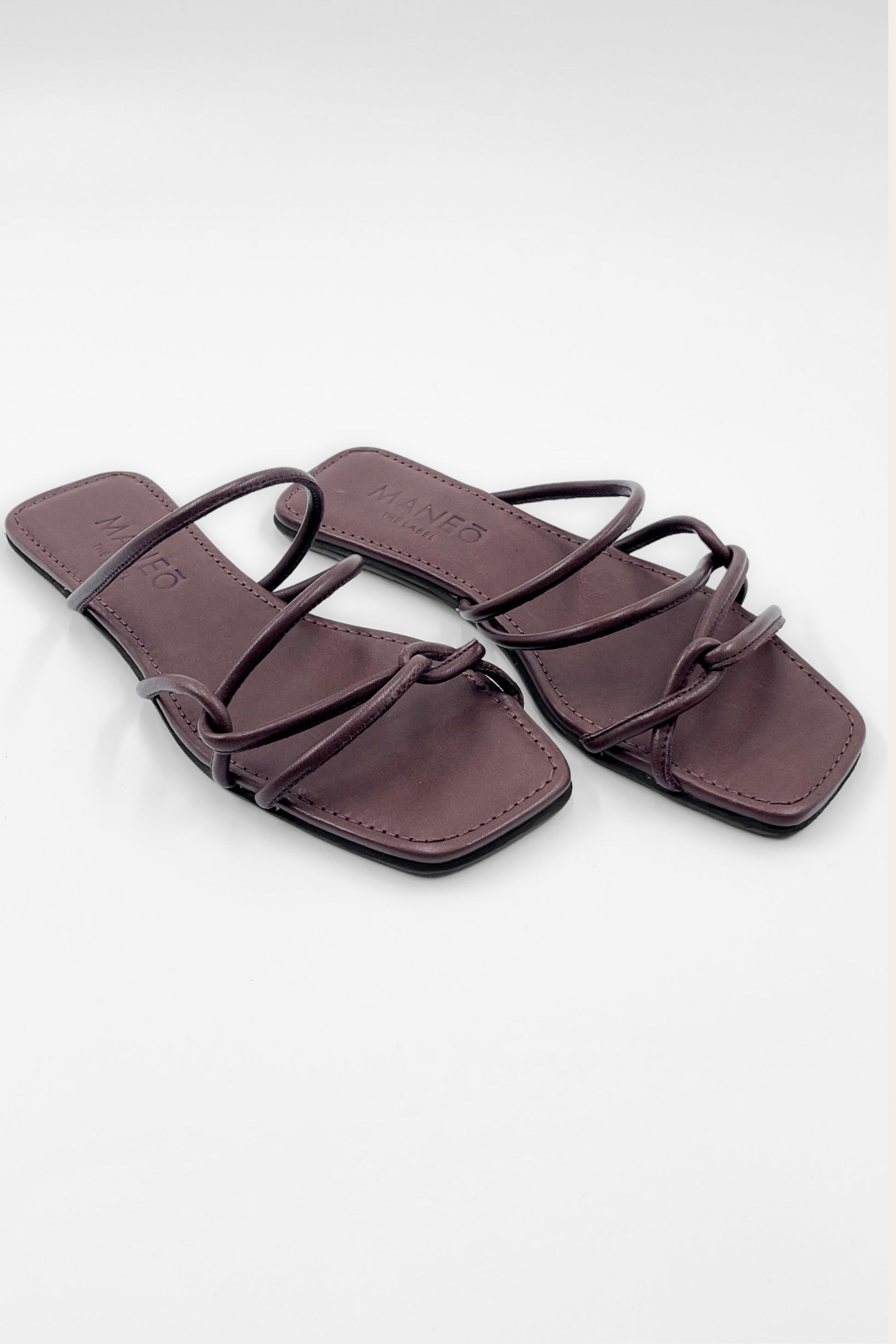 • Flat silhouette, Tubular strap design, Soft leather, Open square toe