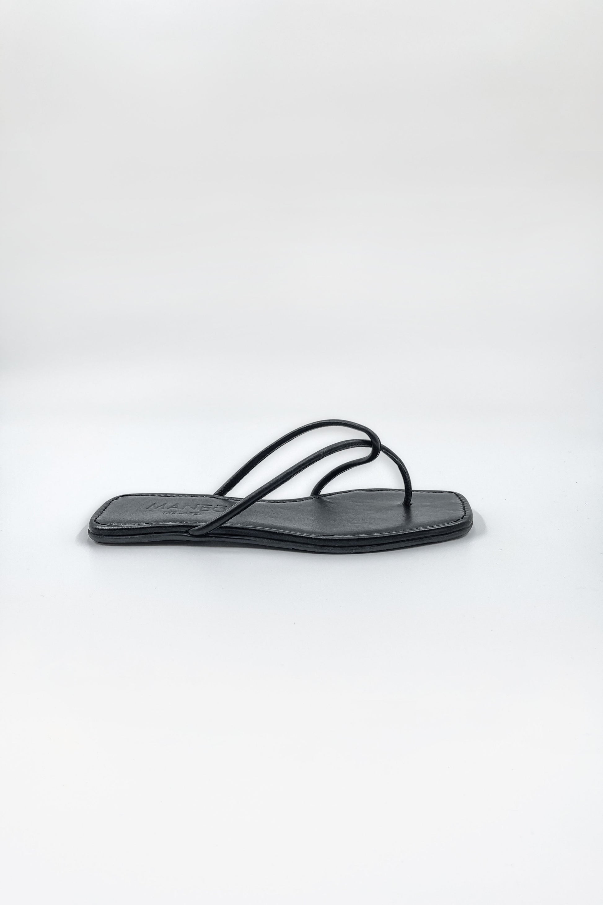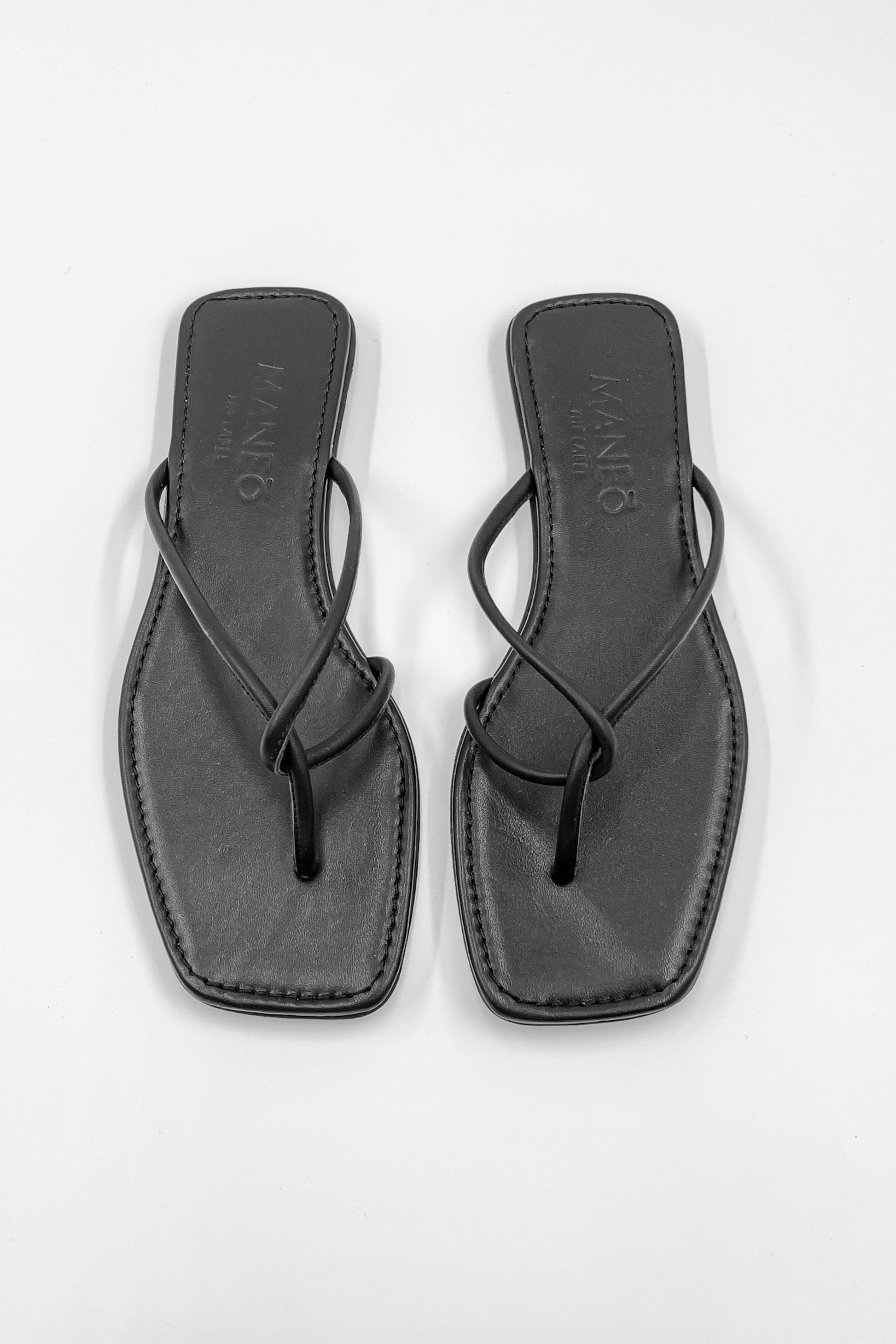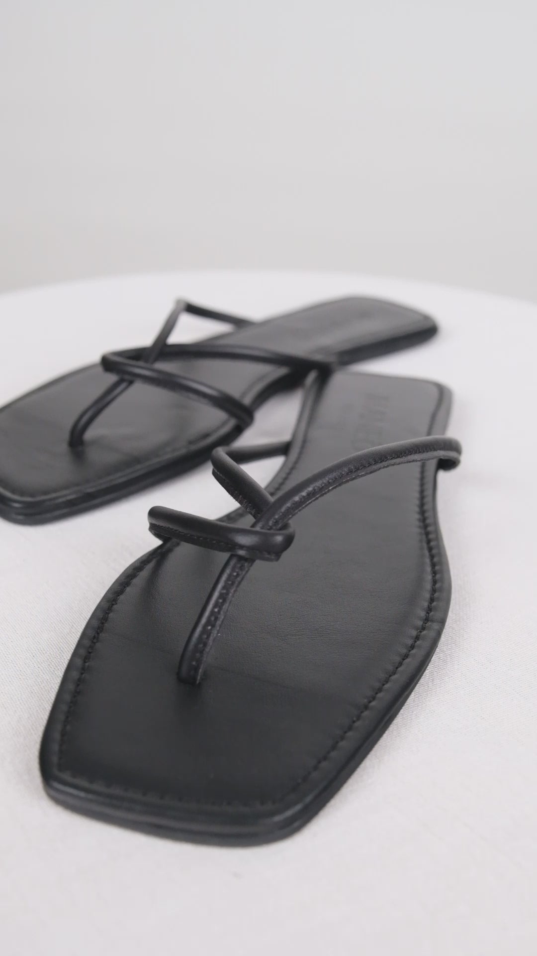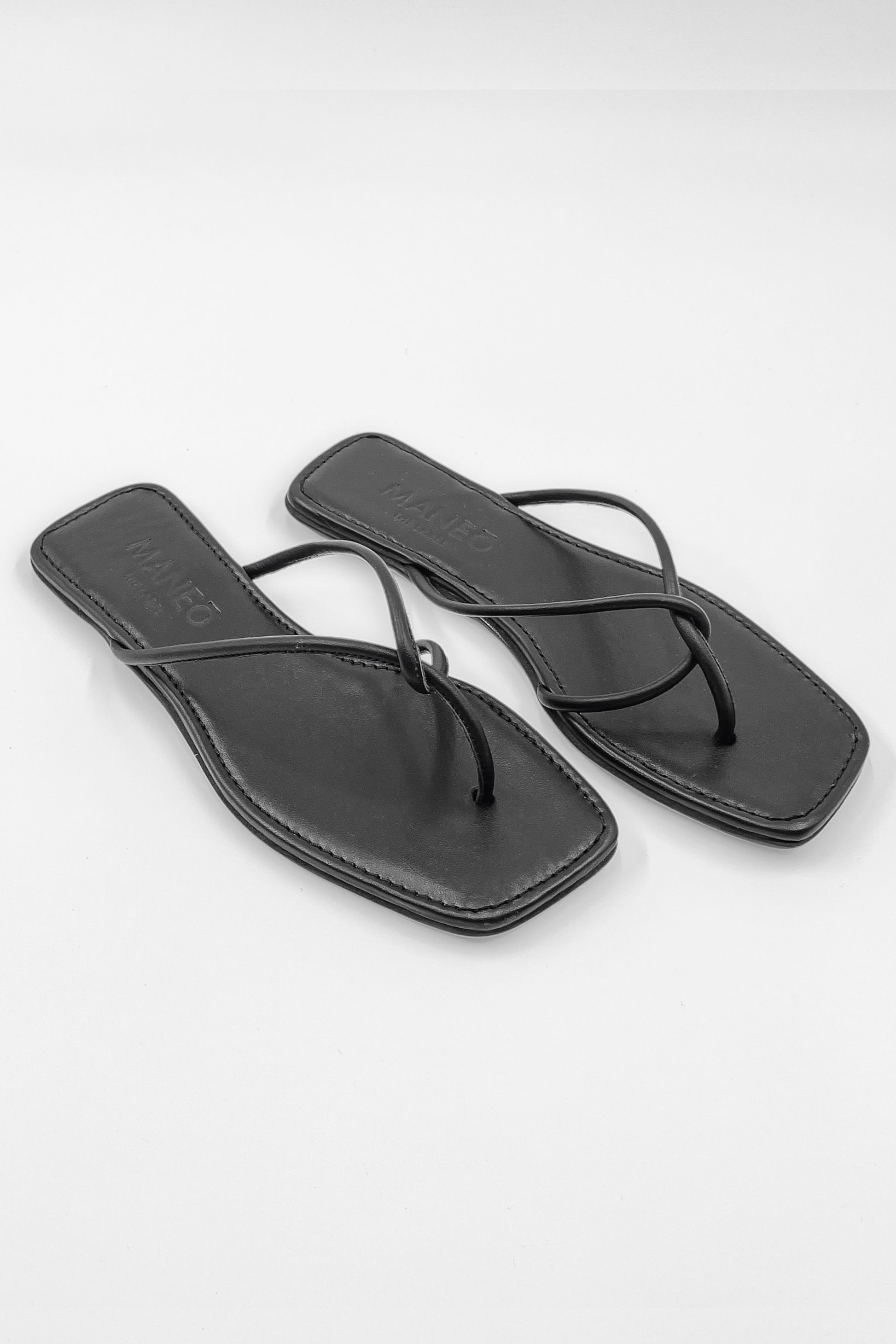 • Flat silhouette, Tubular strap flip-flop design, Soft leather, Open square toe