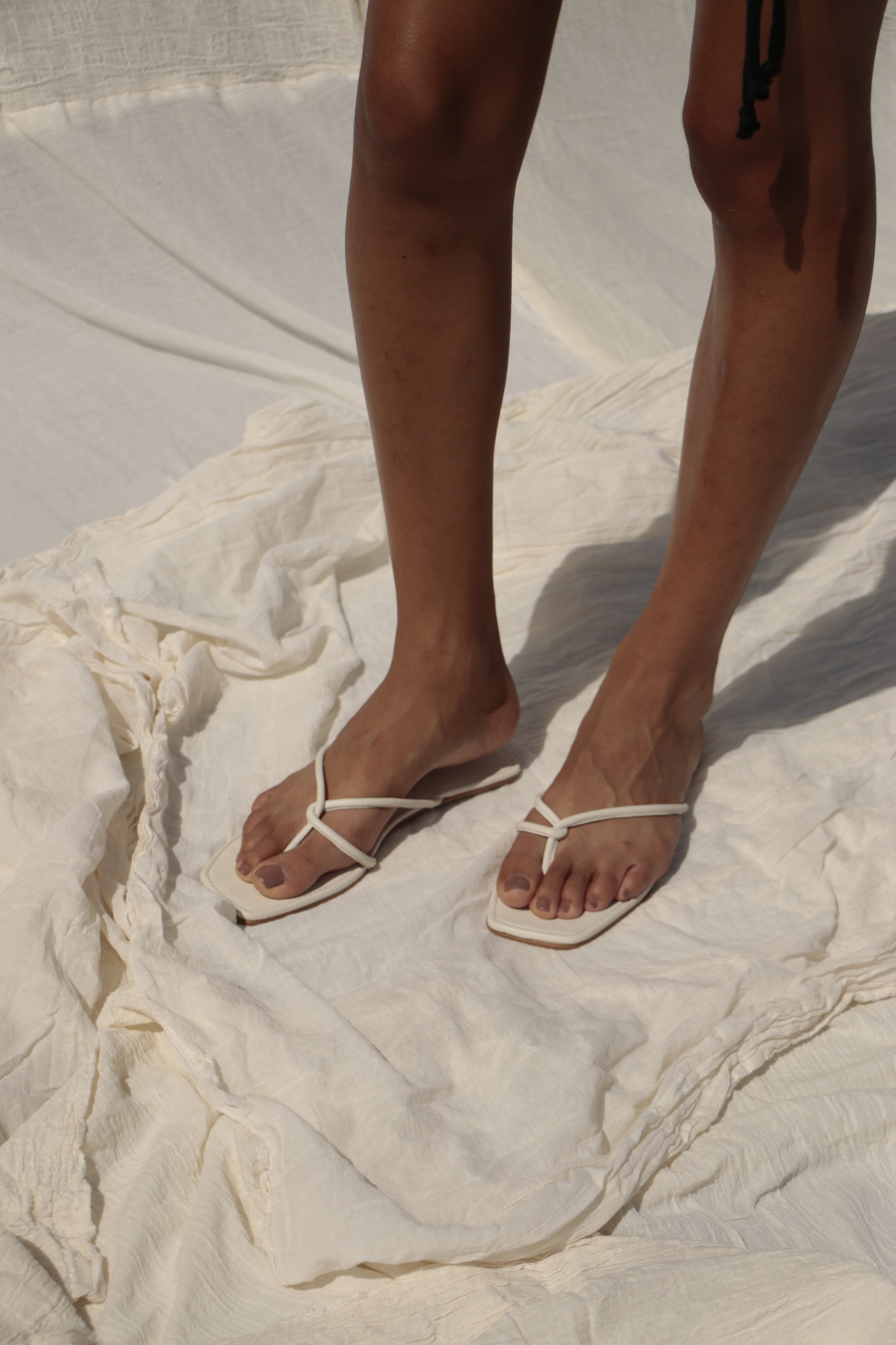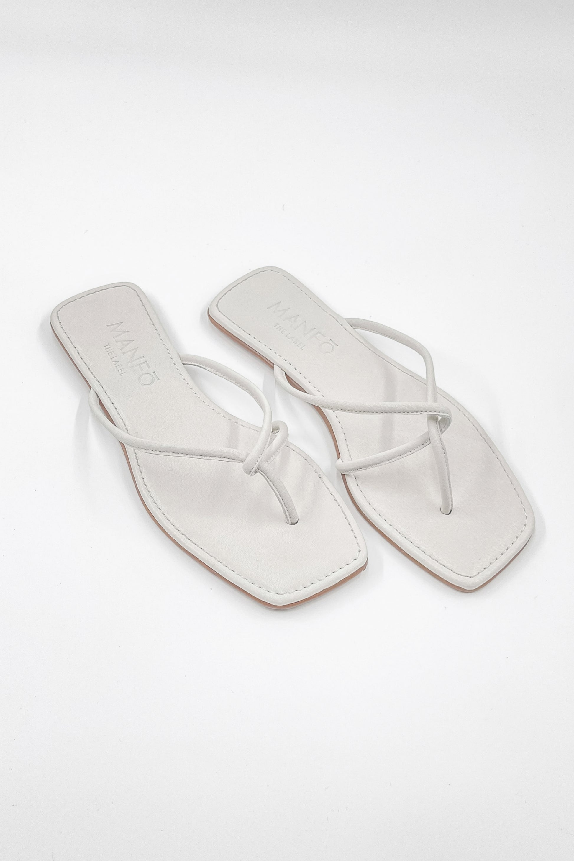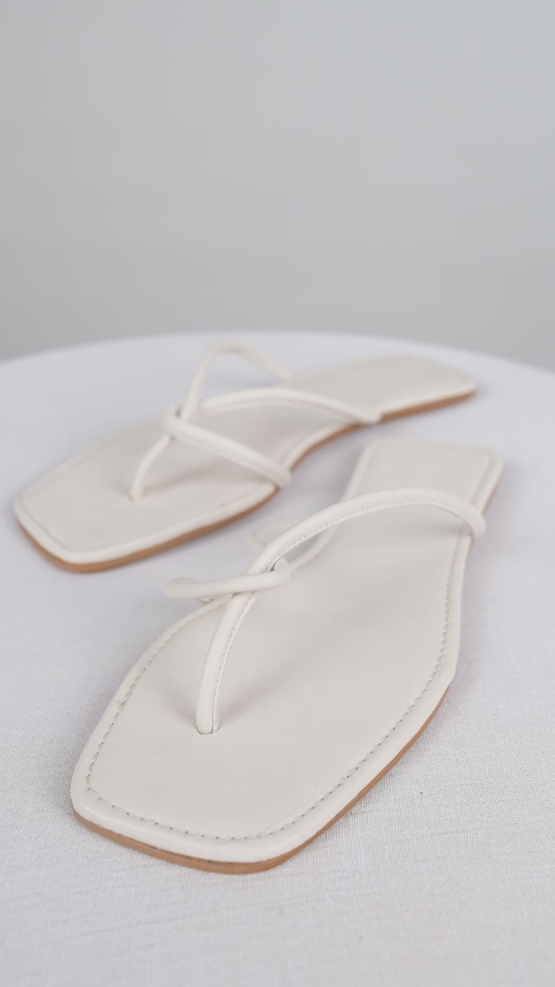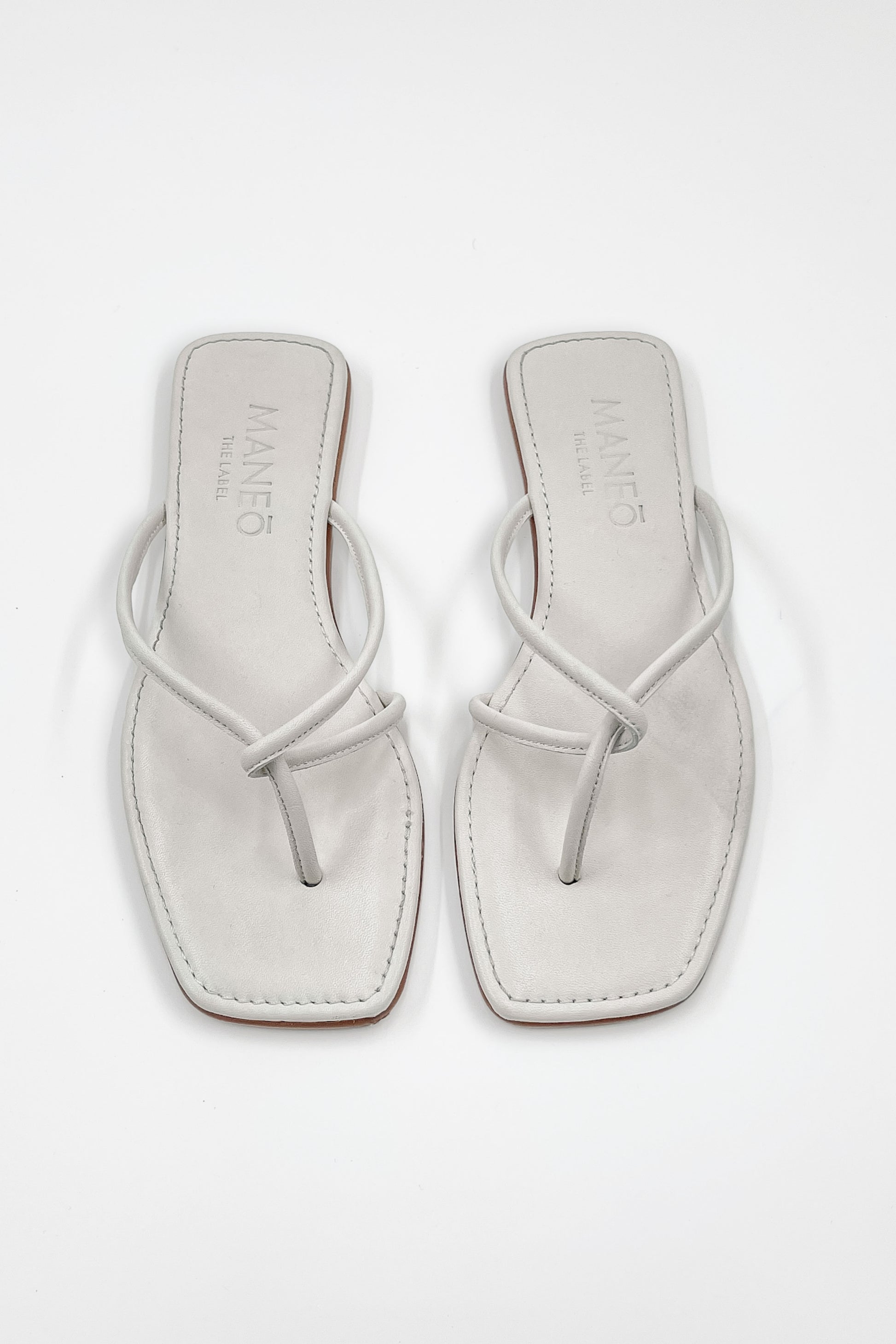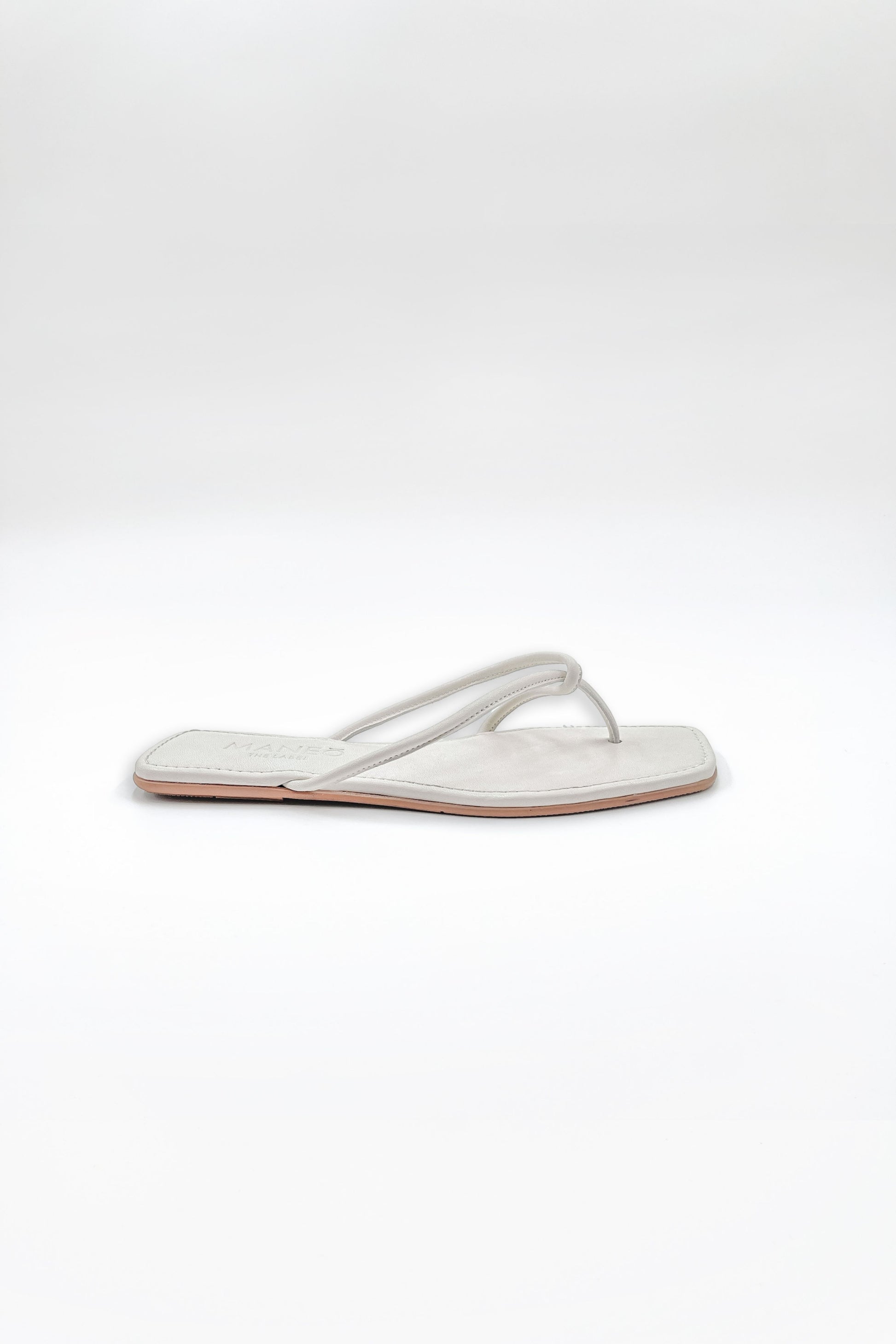 • Flat silhouette, Tubular strap flip-flop design, Soft leather, Open square toe