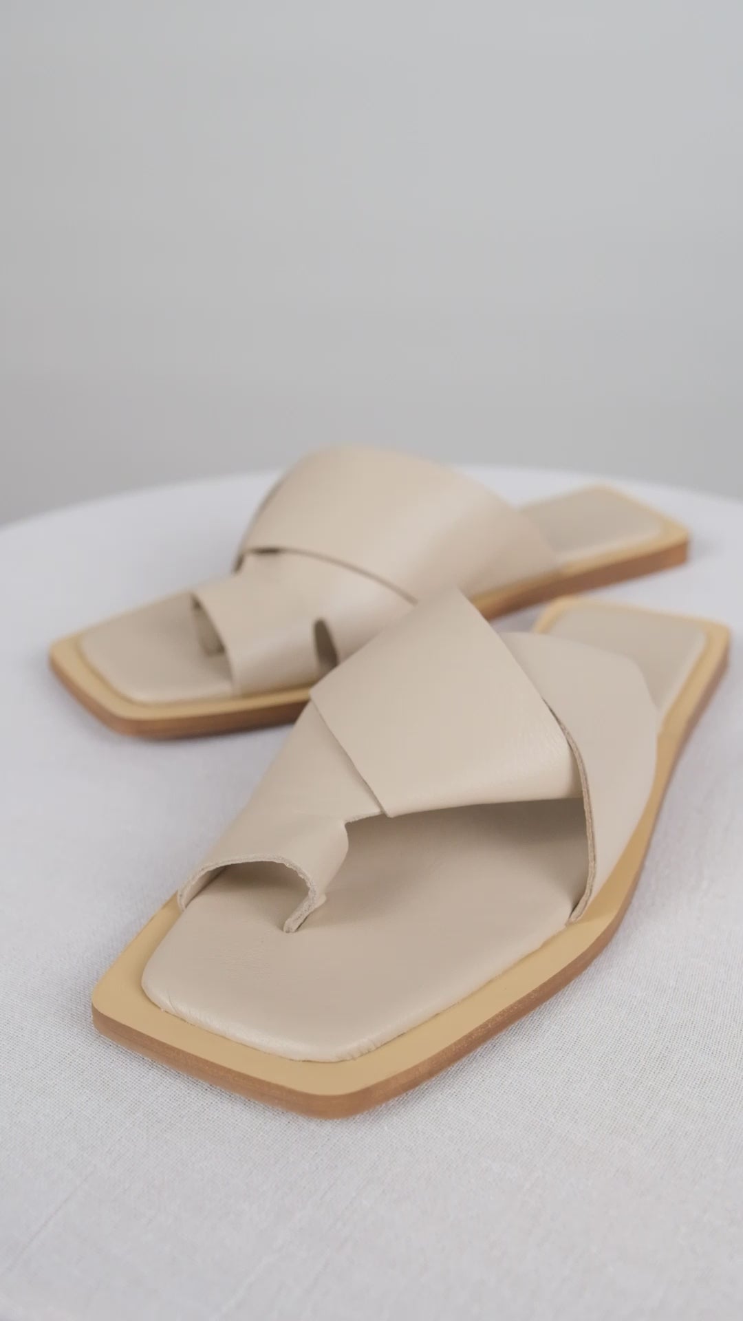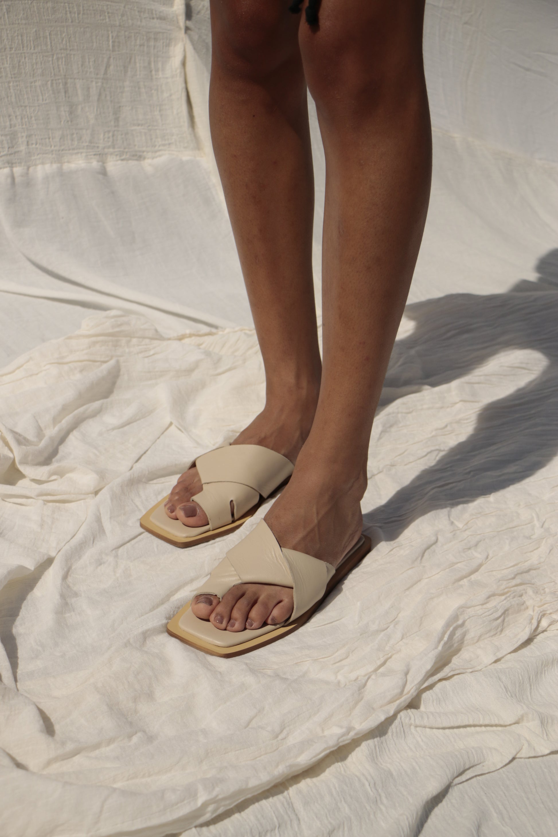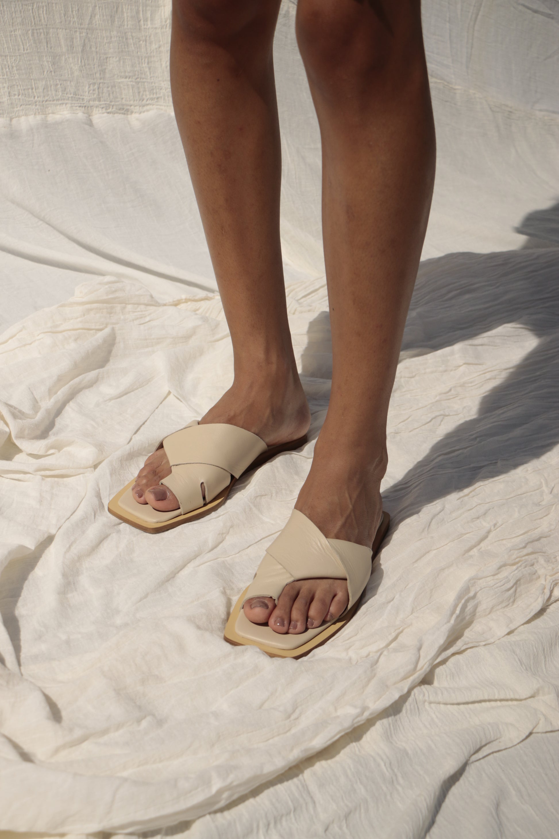 • Flat silhouette, Woven leather straps with toe hold, Soft leather, Open square toe